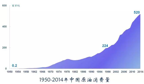 石油在中國一次性能源消費中占比20%,僅次于煤炭,但是是有對國防安全具有重大的戰(zhàn)略意義,是必不可少的戰(zhàn)略資源。中國石油消費與日俱增,從50年代的24萬噸激增至2014年的5.2億噸,是建國時的2600倍。