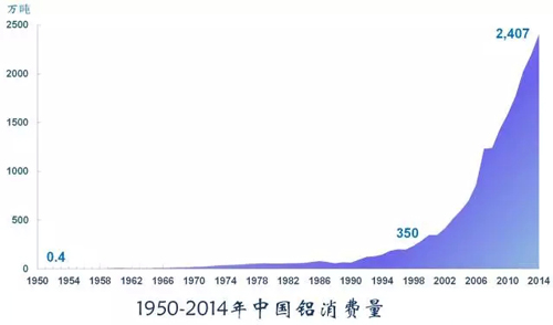 鋁是全球消費量最大的有色金屬,是目前應用十分廣泛的最經(jīng)濟適用的原材料之一。中國鋁消費持續(xù)穩(wěn)定增長,2014年的消費量是2000年消費量的7倍,是1950年的3400多倍。