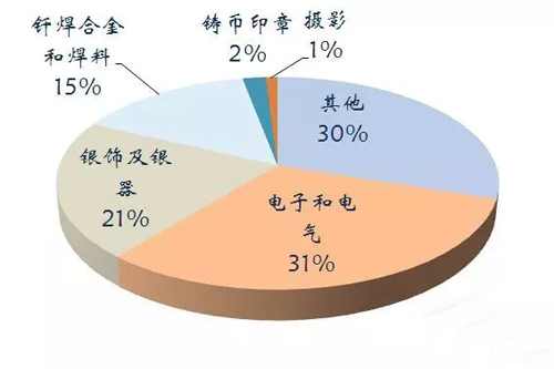 銀主要應用于工業(yè)、醫(yī)學、首飾3個方面。我國銀的主要用于電子電器工業(yè)、焊接合金以及首飾加工等。2014年中國銀儲量4.3萬噸,產(chǎn)量4200噸。