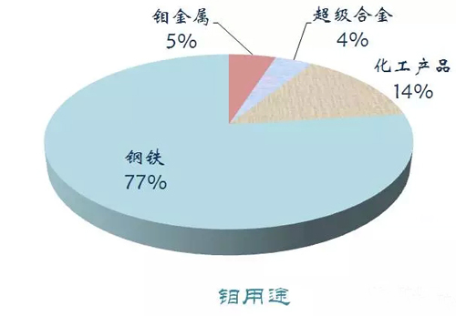 鋼鐵行業(yè)是鉬的主要消費領(lǐng)域,其消費量占中國鉬總消費量的75%以上。2014年我國鉬儲量430萬噸,產(chǎn)量10萬噸。