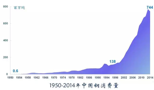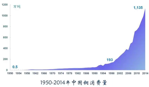 鋼鐵用量約占金屬消費的75%,是工業(yè)的骨骼。鋼鐵是工業(yè)化過程中最重要的原材料之一,2014年中國消費鋼鐵7.44億噸,是建國時的1240倍。